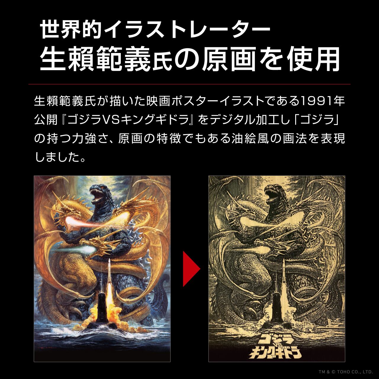 生賴範義氏が描いた映画ポスターイラストである1991年公開『ゴジラVSキングギドラ』をデジタル加工し「ゴジラ」の持つ力強さ、原画の特徴でもある油絵風の画法を表現しました。