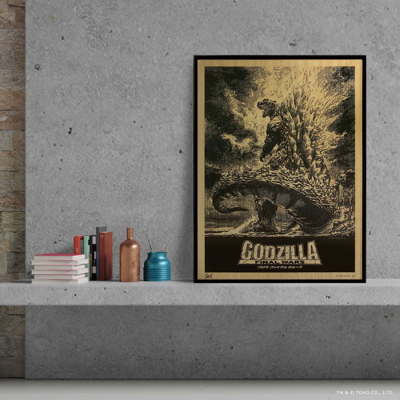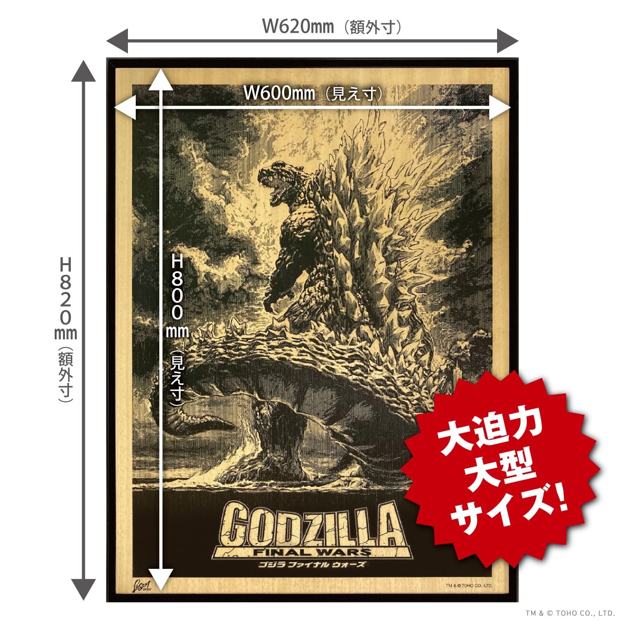 生賴範義氏が描いた映画ポスターイラストである2004年公開『ゴジラ FINAL WARS』をデジタル加工し「ゴジラ」の持つ力強さ、原画の特徴でもある油絵風の画法を表現しました。