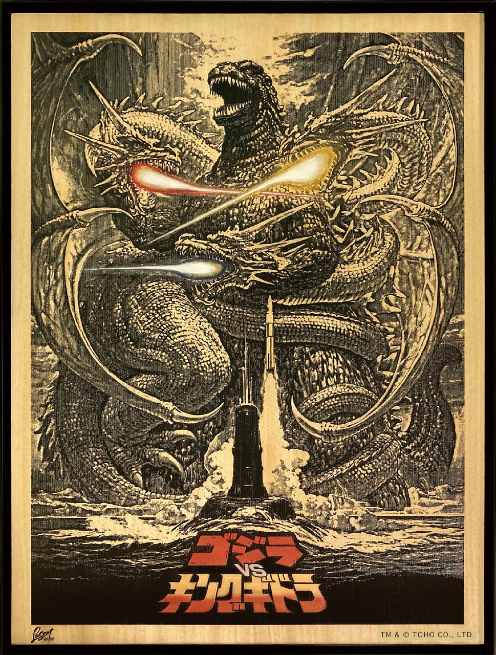 生賴範義氏が描いた映画ポスターイラストである1991年公開『ゴジラVSキングギドラ』をデジタル加工し「ゴジラ」の持つ力強さ、原画の特徴でもある油絵風の画法を表現しました。
